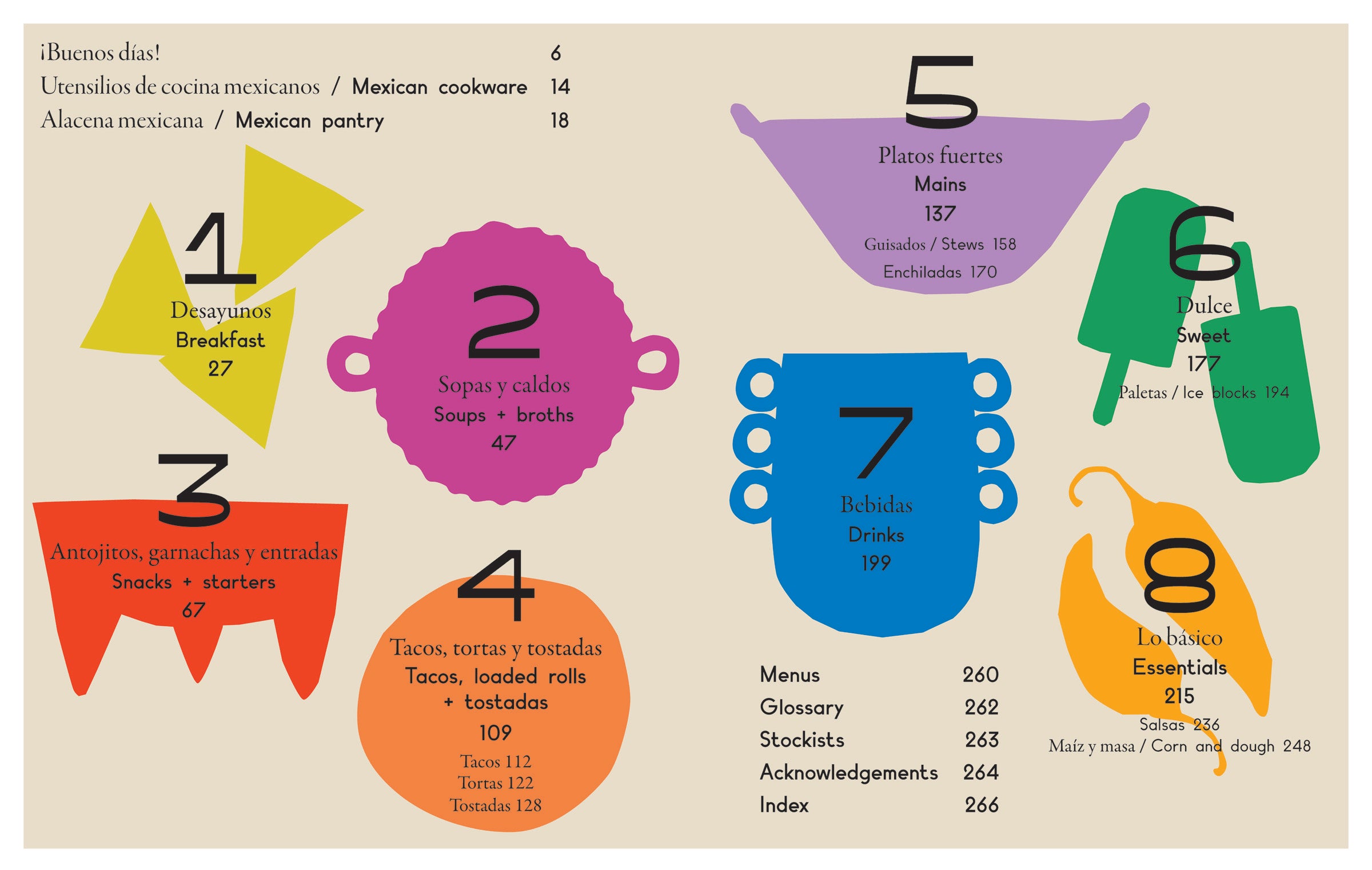 Chapters include: * Desayunos: Breakfast, including chilaquiles, huevos rancheros, mole eggs * Sopas y caldos: Soups, including bread soup, tortilla soup, poblano chilli soup, Yucatan-style chicken soup * Antojitos, garnachas y entradas: Snacks and starters, including guacamoles, chipotle dry pasta, mushroom chorizo gordita, quesadillas fritas, fish ceviche with mango and avocado * Tacos, tostadas y tortas: Tacos, tortillas and loaded rolls, including stuffed jalapeno chillies taco, pickled pork skin tostadas, steak and cheese torta